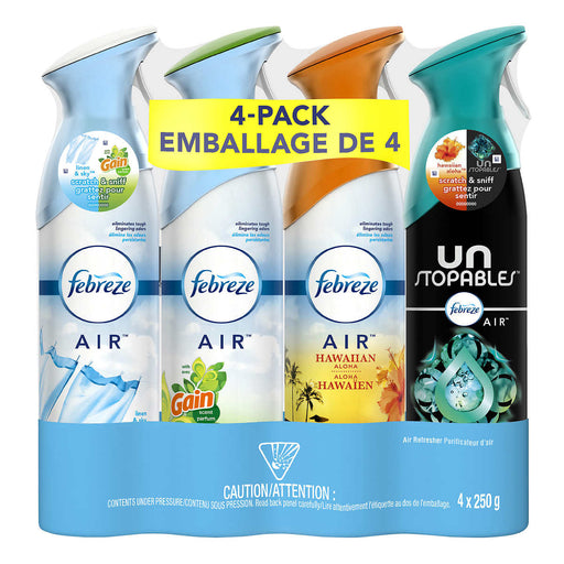 FEBREZERafraîchisseur d'air Parfums : 1 lin et ciel, 1 Hawaiian Aloha, 1 Gain, 1 Unstopables 4 bouteilles de 250 g