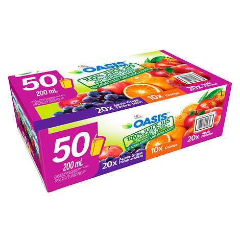OASIS100% jus Saveurs assorties : 20 pomme-raisin, 10 orange, 20 pomme Excellente source de vitamine C Sans sucre ajouté 50 × 200 ml