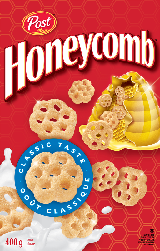 POSTIntroduite en 1965 et composée de maïs à grains entiers, d'avoine et de vrai miel, Honeycomb est une céréale Post classique.